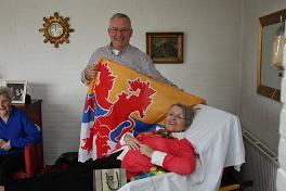 Daar aangekomen zaten ze met smart op haar te wachten! Iedereen had cadeautjes meegenomen en ze werd versierd met de Limburgse vlag. Onder het genot van vlaai en koffie werd er flink bij gekletst.