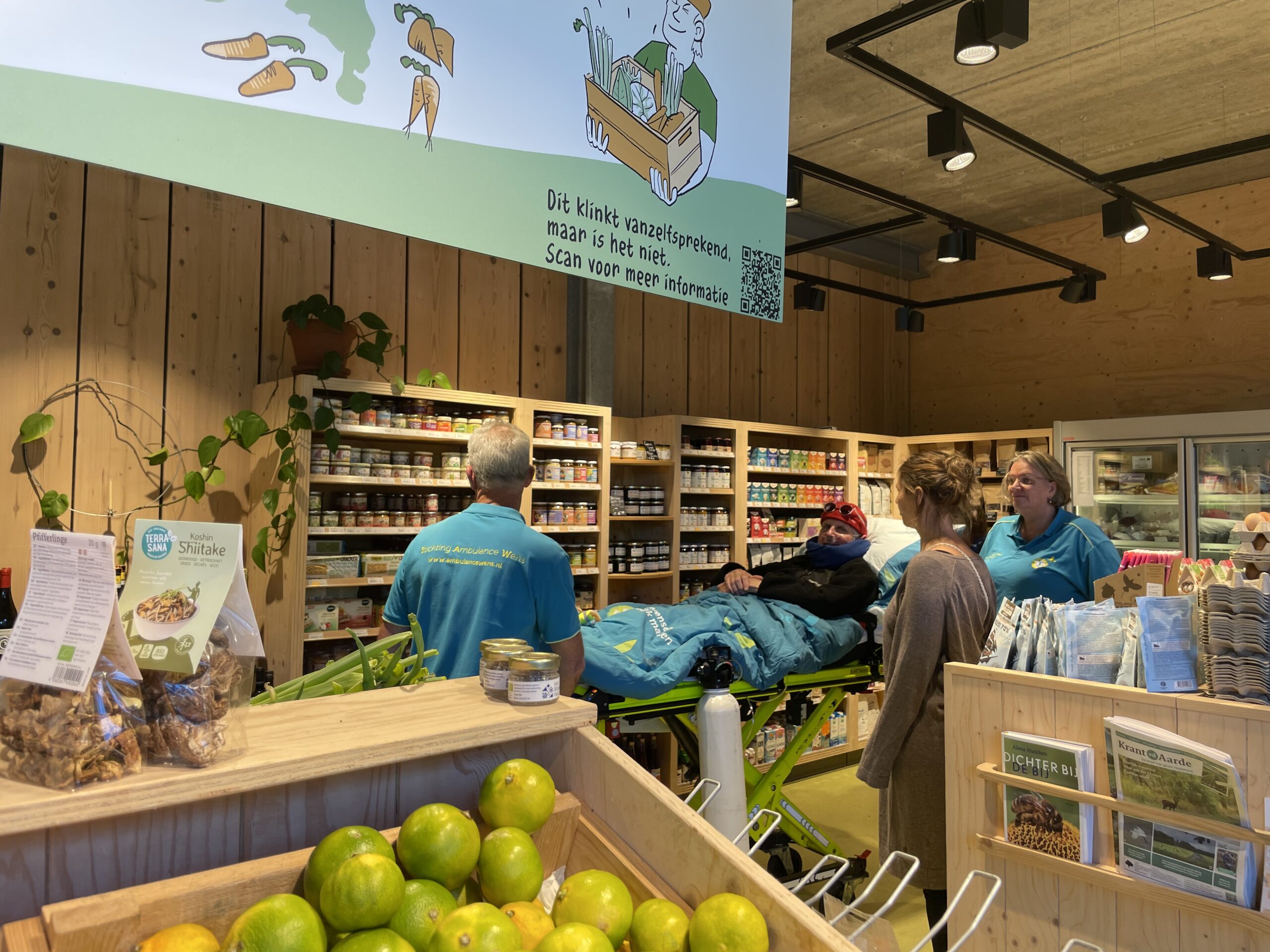 Dat is helemaal gelukt! Met veel dank aan Jannie (verpleegkundige) en Hans (chauffeur), voor hun warme aanwezigheid en goede zorgen! Fijn dat jullie duidelijk gewend zijn om je nergens wat van aan te trekken en huppakee met brancard een winkel en strandtent in gingen. Bijzonder ook wat zo’n ambulance en brancard voor een effect heeft op de omgeving; iedereen is meteen lief en behulpzaam. We hebben allen met volle teugen kunnen genieten!