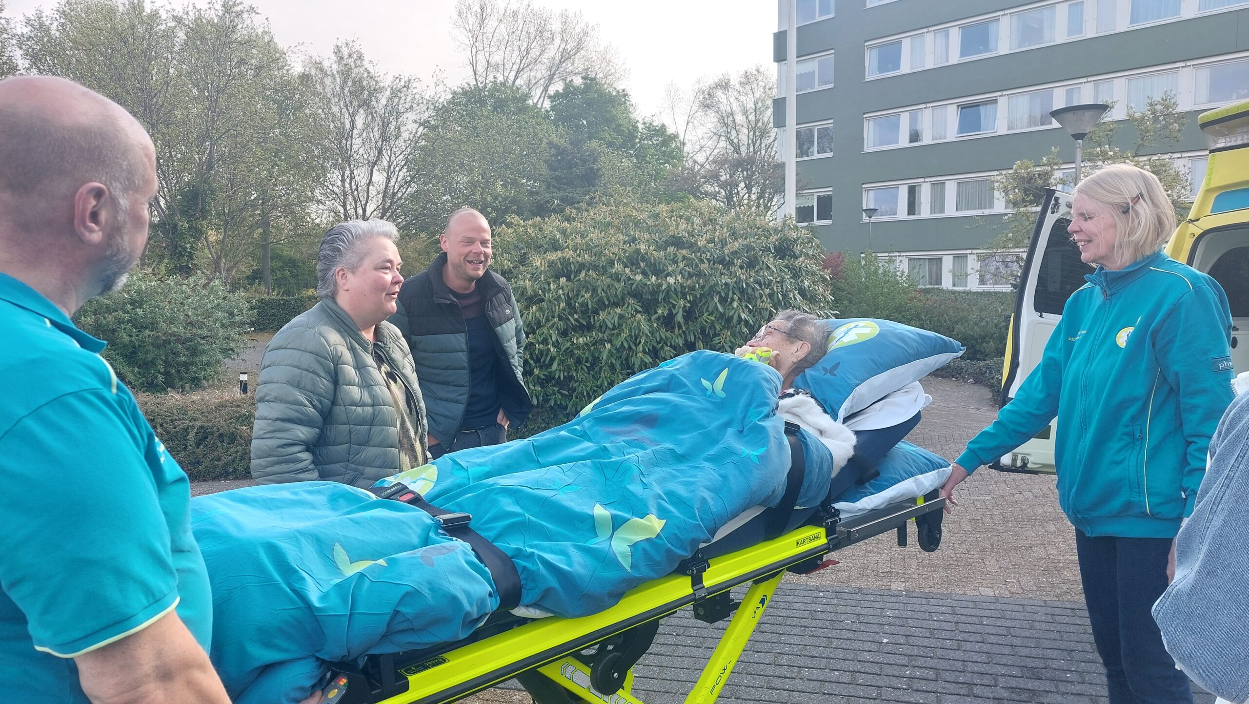 Hoewel Vonny bedlegerig is en haar kamer normaal niet meer verlaat, werd met zorg en liefde alles in werking gezet om dit toch mogelijk te maken. Binnen een dag was het geregeld. En op die zondagochtend stond de Stichting Ambulance Wens stipt om 9.00 uur voor de deur van Oostergouw. Vonny wist van niets – en haar verrassing en ontroering waren groot.