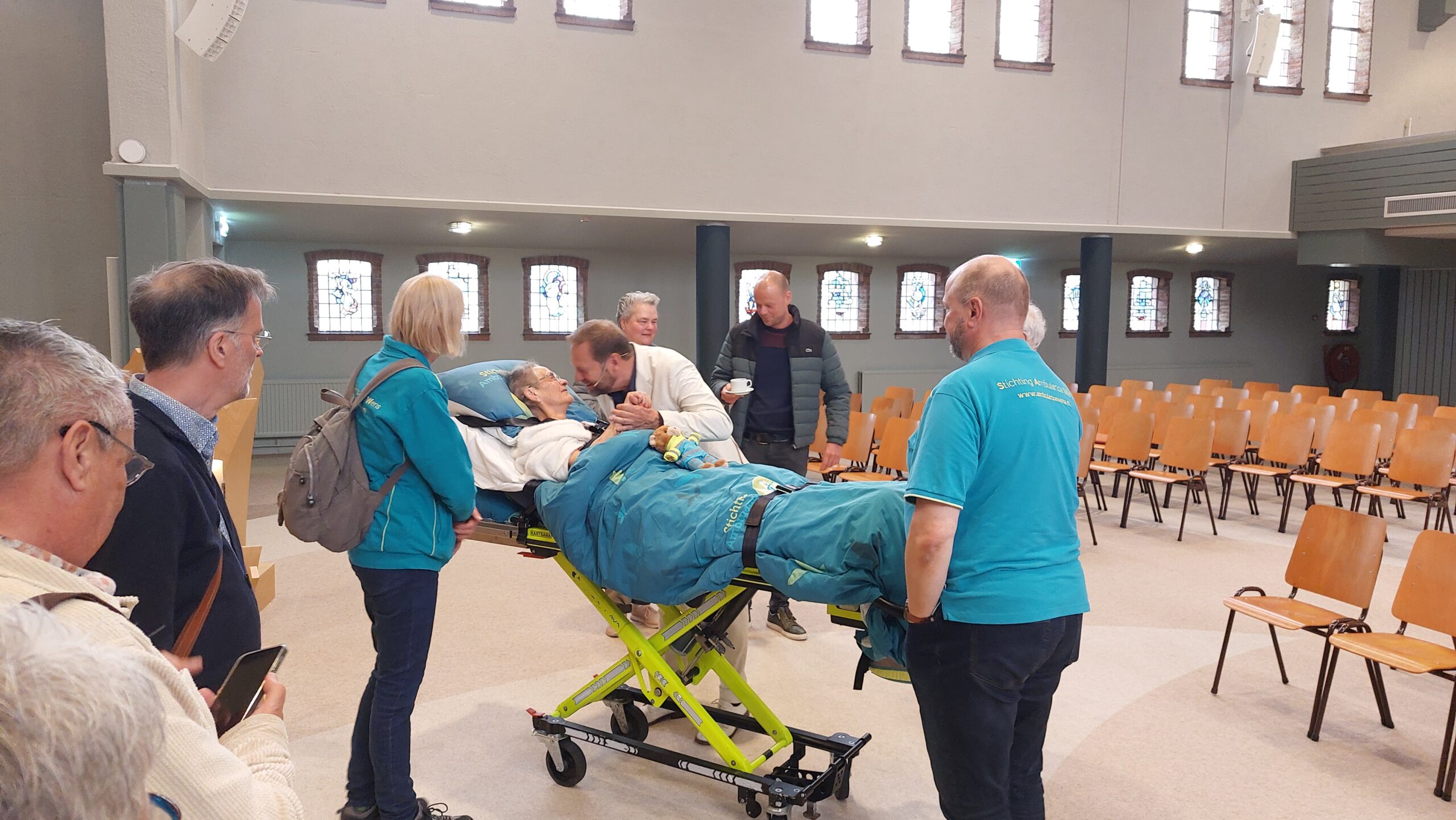 Omringd door behulpzame handen werd ze voorzichtig op de brancard gelegd, klaar voor haar reis vol herinneringen en betekenis. De ontvangst in de kerk was hartverwarmend, de dienst vol muziek en emotie, en Vonny stond geregeld in het middelpunt van de belangstelling. Ze genoot zichtbaar van elk moment.