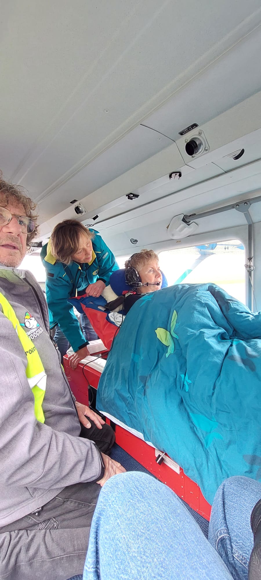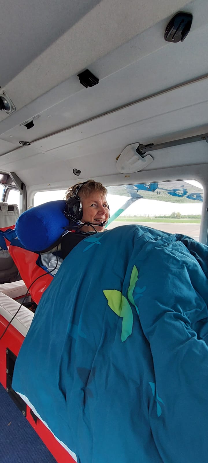 Dat gaan we regelen, werd heel makkelijk gezegd en zo geschieden. Ik werd, samen met mijn dochter en goede vriendin, ‘s morgens om 8.30 uur thuis opgehaald door hele lieve enthousiaste vrijwilligers, Marlies en Leo! Van Utrecht naar Lelystad gereden en daar in een vliegtuigje geholpen en jawel hoor naar Utrecht rondje om de Dom gevlogen Wat een schitterend uitzicht!! Terug in Lelystad stelden ze voor om ergens nog iets te drinken. Dus bij een restaurant met brancard en al naar binnen gereden. De hele dag was een warm bad voor ons maar ook de vrijwilligers heb ik zien genieten. Het is ongelooflijk hoe op zo’n korte termijn met zoveel liefde zoiets moois voor mij geregeld kon worden Ik dank jullie uit het diepst van mijn hart en weet zeker dat jullie nog heel veel mensen blij gaan maken met jullie geweldige inzet en Stichting.