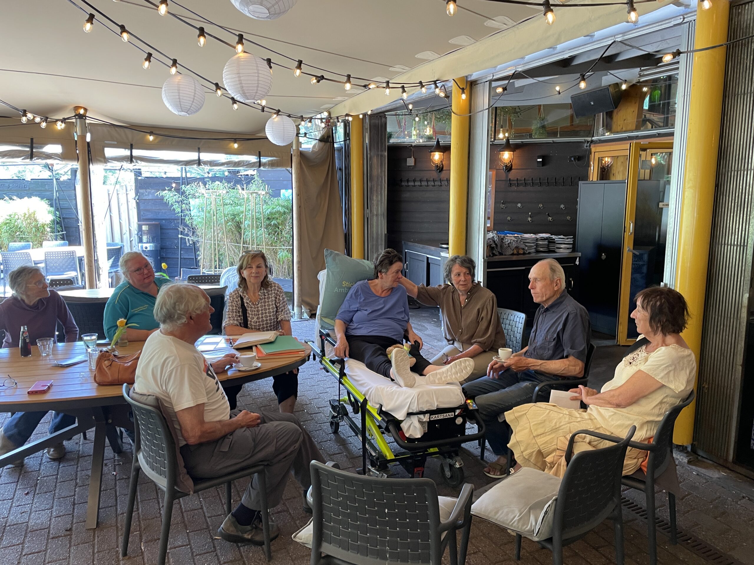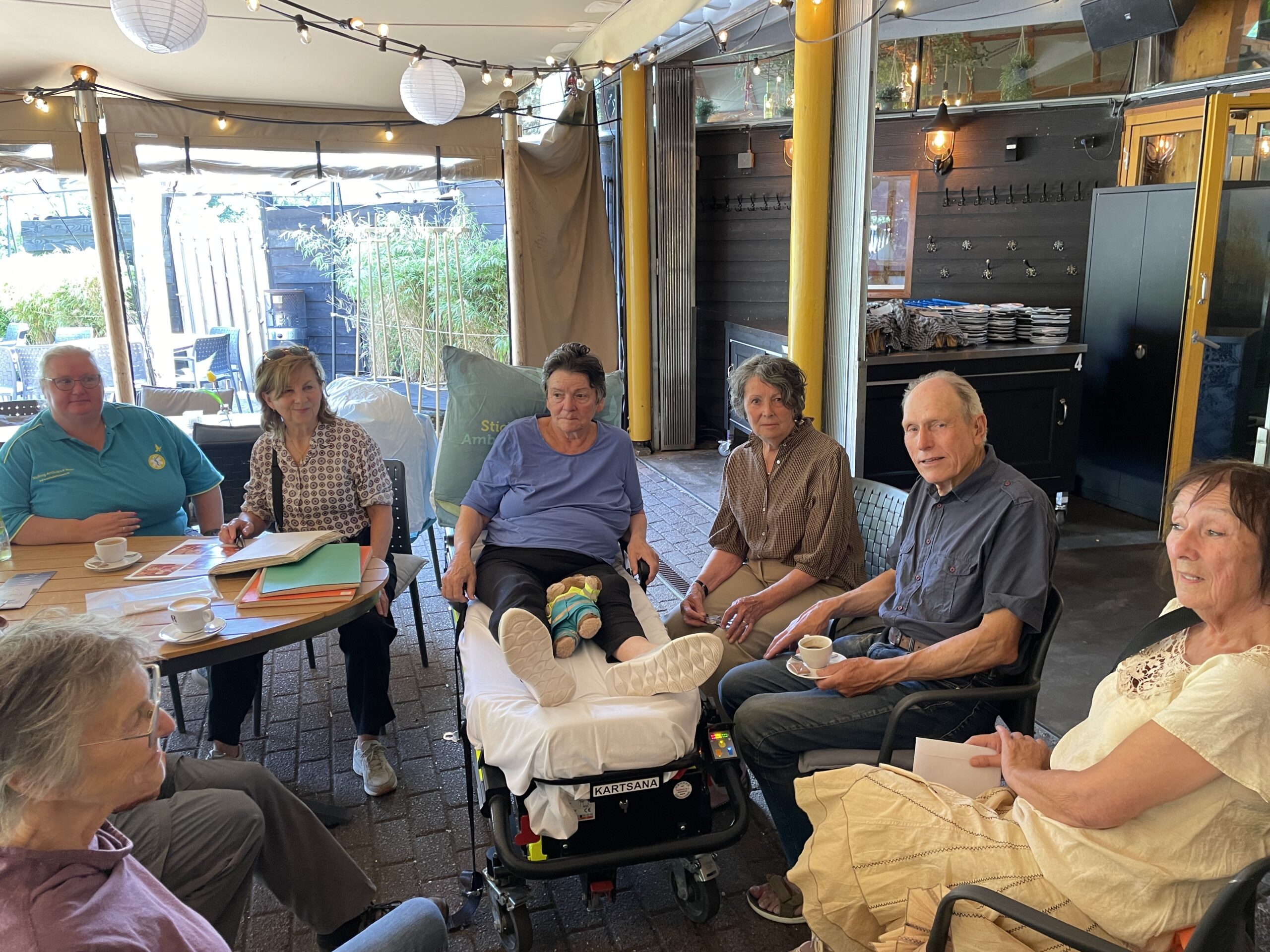 Op 11 juli vertrok de ambulance van het Heymanscentrum in Groningen voor de lange reis naar Delft. Rond één uur kwamen we aan bij restaurant KNUS in de Delftse Hout. Vrienden uit haar Delftse tijd: Juliëtte, Rita, Alice, Theo en Eveline, wachtten haar daar op. Door afasie kan Helma niet praten, maar desondanks is er al weer snel een innig contact. Foto’s uit de oude tijd worden bekeken, verhalen worden aan Helma verteld. Met “ja” (of “nee”) knikken kan zij aangeven of zij de herinnering deelt. Binnen de kortste keren is gezelligheid troef. Niet in de laatste plaats door de Ambulance Wens aangeboden drankjes en lunch. De tijd vliegt, en de ambulance moet weer vertrekken.
