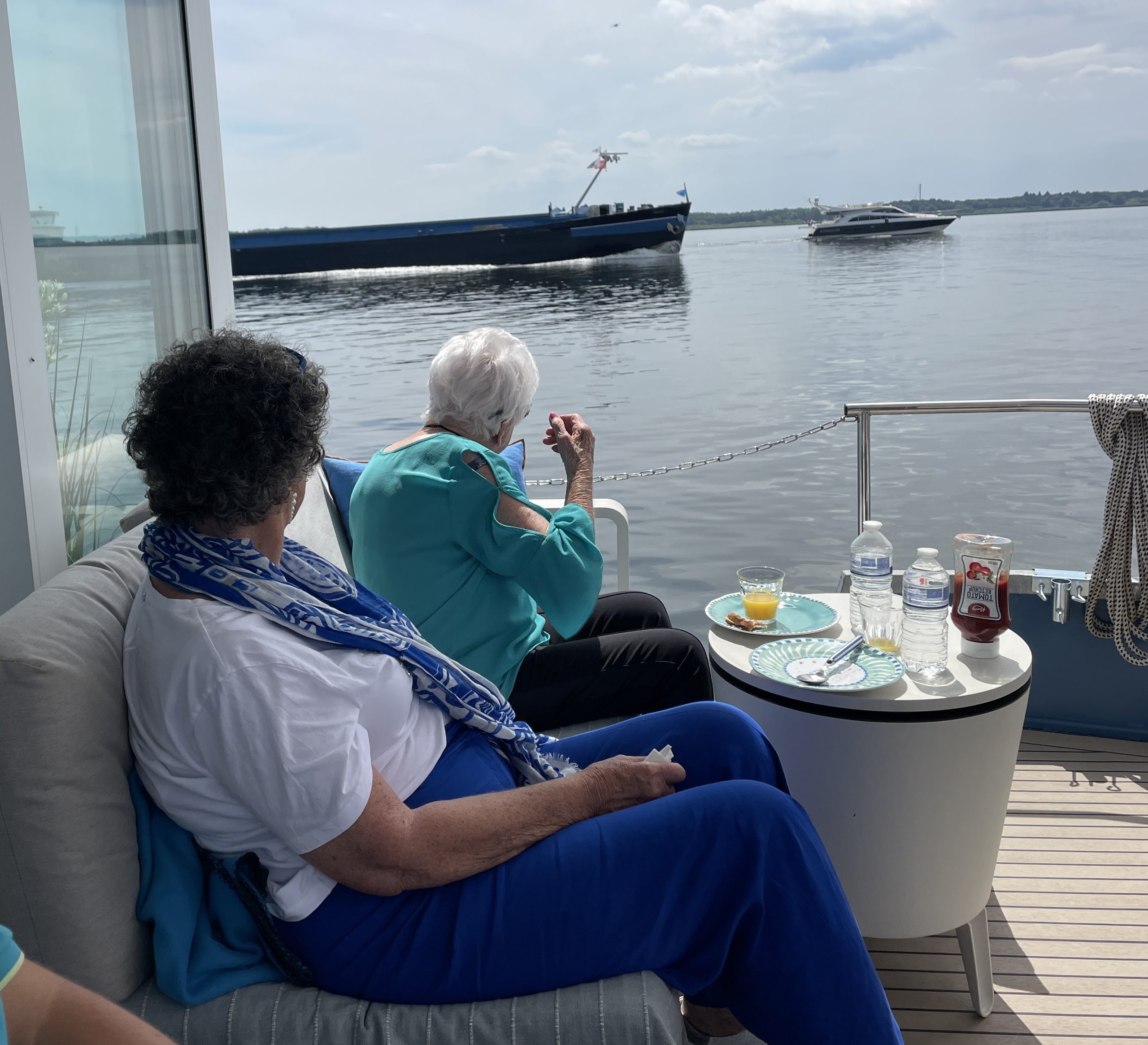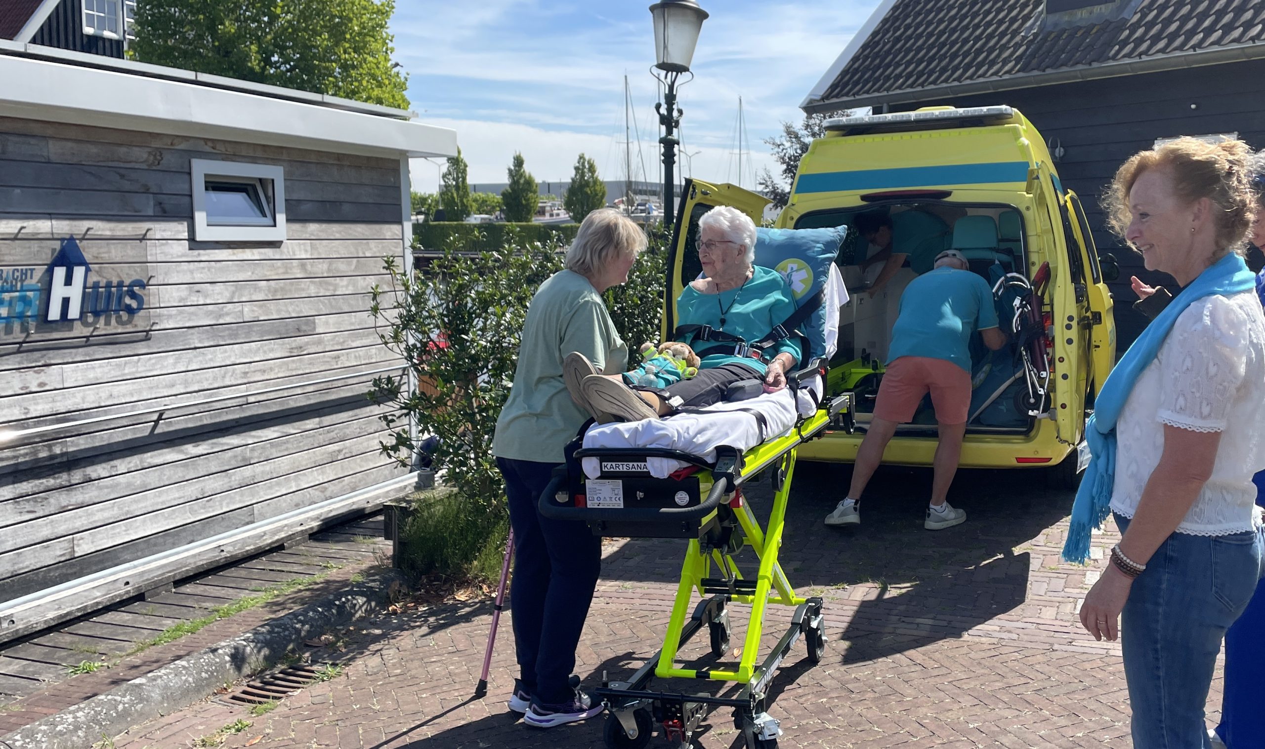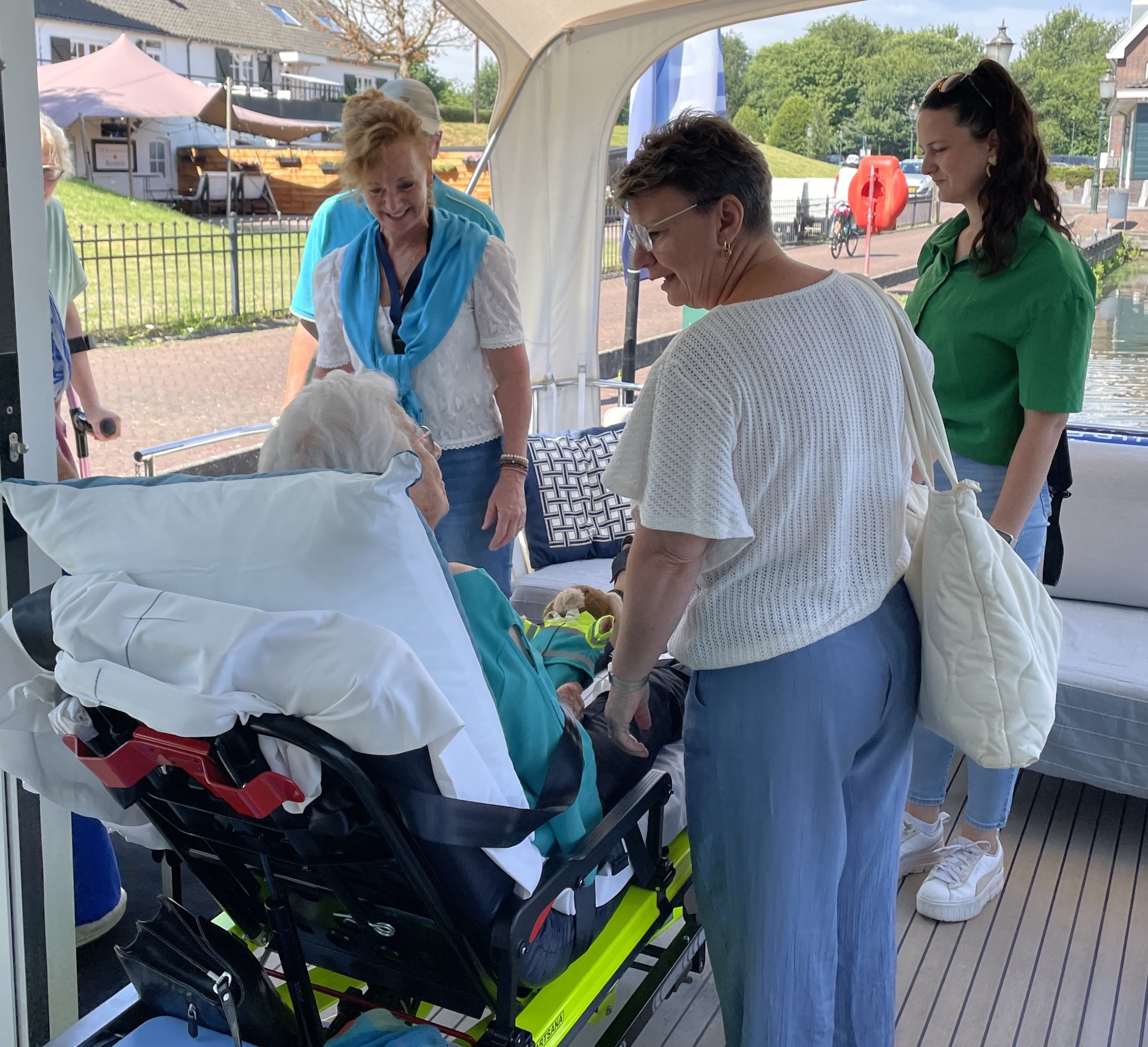 Toen de Ambulancewagen “Het WaterHuis” naderde waren we benieuwd naar de persoon die er in lag. Het was een dame van 95 met haar zus en mantelzorgers. Ze hadden een lange rit (regio Rotterdam) achter de rug en men genoot bij het zien van het grote voordek van “Het WaterHuis”. Mevrouw ging resoluut van de brancard af. We maakten een opstelling van de banken en stoelen en dat gaf mevrouw een mooi uitzicht.