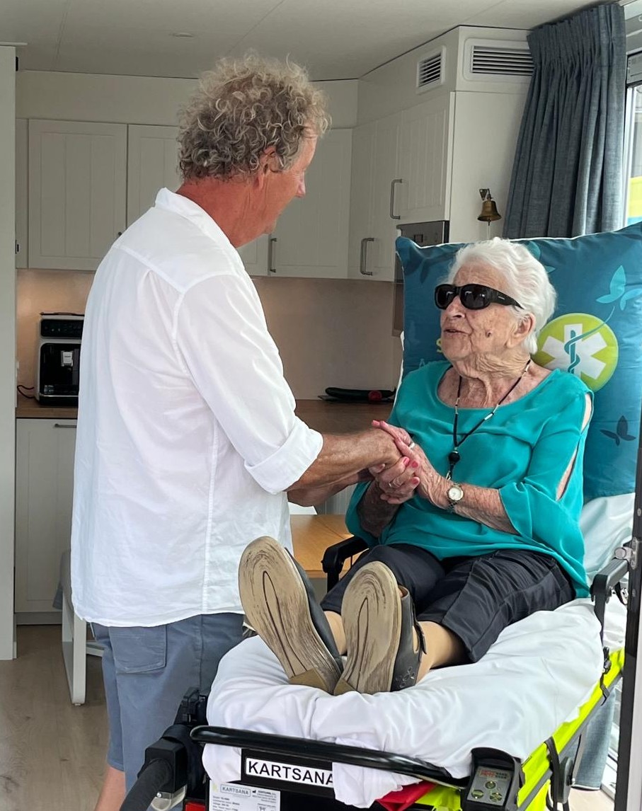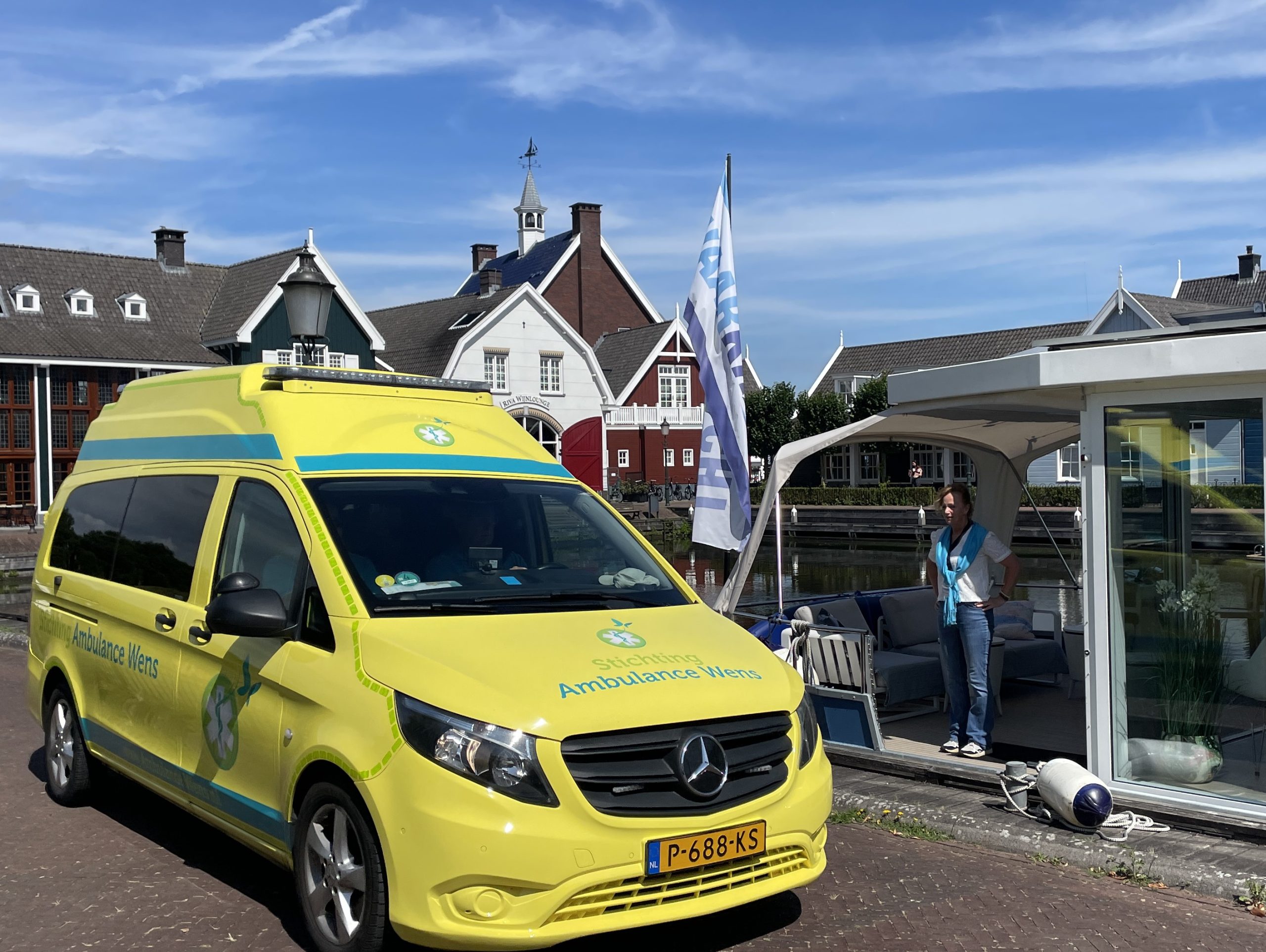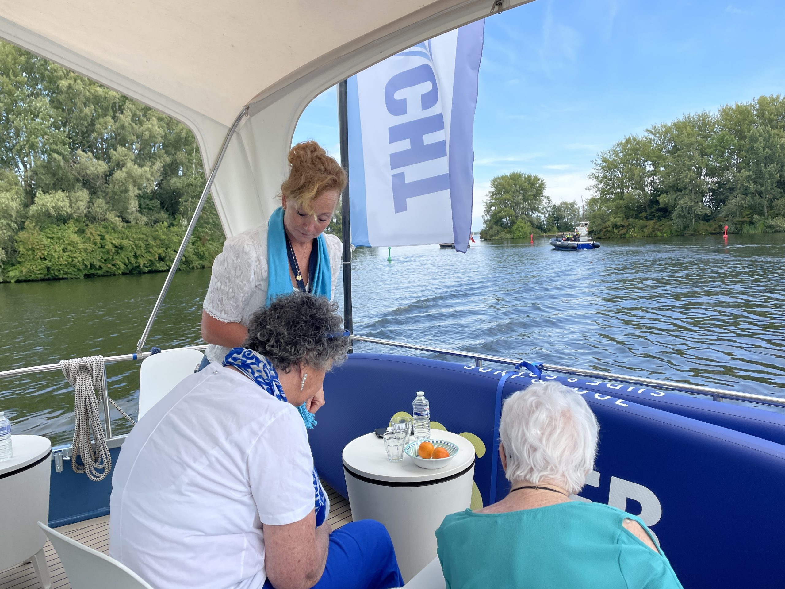 Toen de Ambulancewagen “Het WaterHuis” naderde waren we benieuwd naar de persoon die er in lag. Het was een dame van 95 met haar zus en mantelzorgers. Ze hadden een lange rit (regio Rotterdam) achter de rug en men genoot bij het zien van het grote voordek van “Het WaterHuis”. Mevrouw ging resoluut van de brancard af. We maakten een opstelling van de banken en stoelen en dat gaf mevrouw een mooi uitzicht.