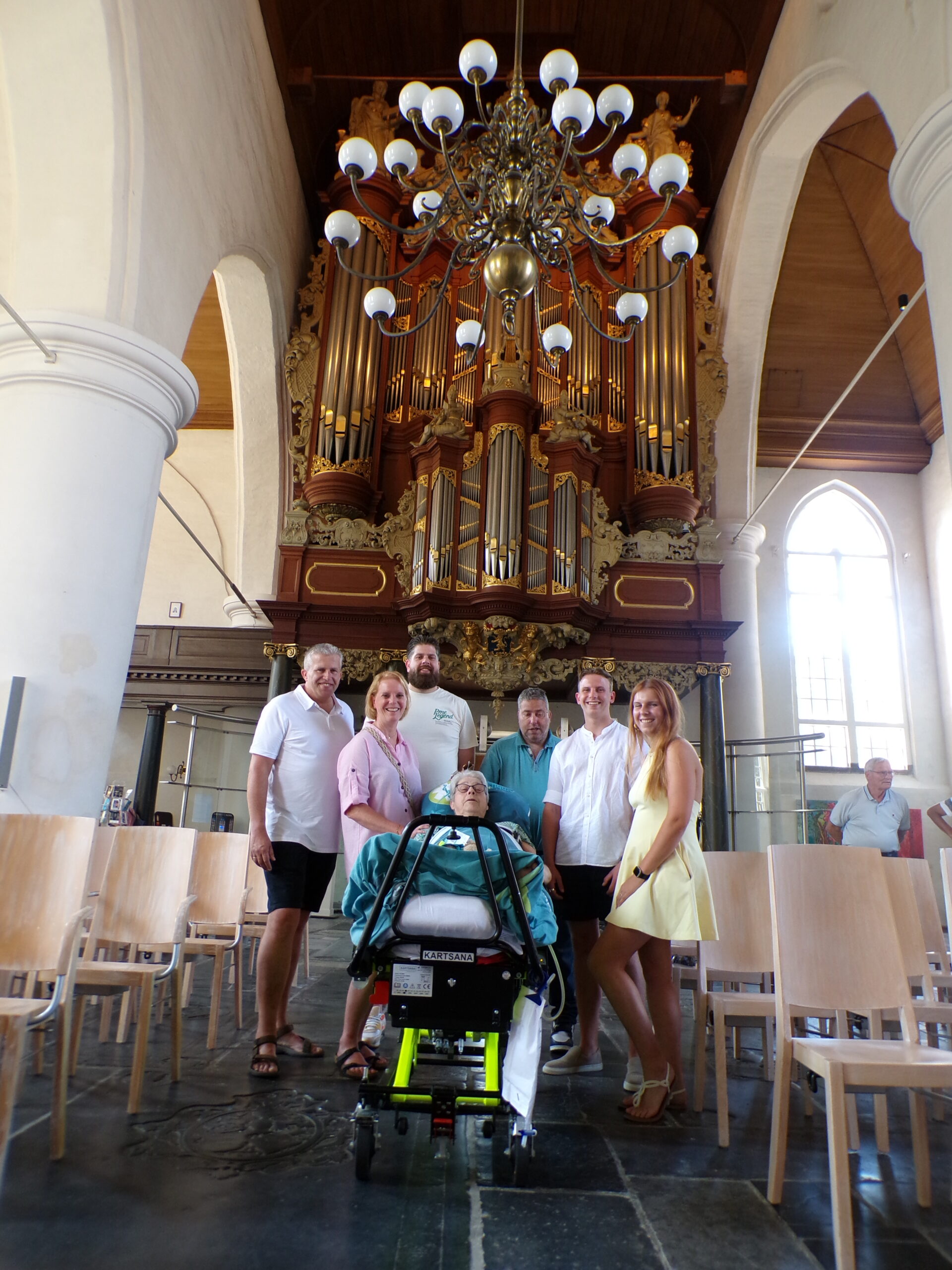 Bij aankomst bij de Jacobijnerkerk stond een groepje familie en vrienden ons al op te wachten en was de muziek buiten al te horen. Onder het ‘Eens als de bazuinen klinken’ werd ons Mem de kerk binnen gereden, wat een mooi geluid! Na dit lied werden nog vele andere verzoeknummers gespeeld door organist Peter. Ze heeft enorm genoten en wij dus ook!
