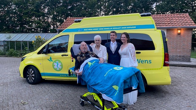 Onze vader werd wel steeds zwakker, en viel enorm af gedurende de zomer. Soms waren er ook spannende momenten waarop hij heel ziek was. Richting de datum 12 september, werd duidelijk, dat vader zeker niet zelfstandig meer naar de bruiloft zou kunnen gaan. Hij was te ziek en te zwak. We bedachten samen, zou Stichting Ambulance Wens wellicht een mogelijkheid kunnen zijn, om toch even naar de bruiloft te kunnen gaan. De ceremonie en kerkelijke inzegening kon hij samen met zijn vrouw thuis online volgen, maar naar het feest gaan was een wens die hij wel had.