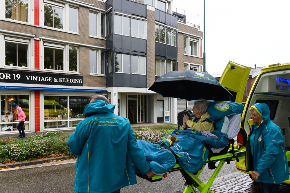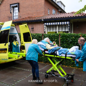 Verpleegkundige Ingrid en chauffeur Frans namen alle tijd en zorg om haar comfortabel op de brancard te leggen — wat een fijn en warm stel zijn zij.
