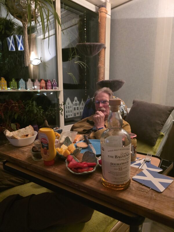 Schotse vlaggetjes, Schotse hapjes en drankjes, het geluid op standje 70…