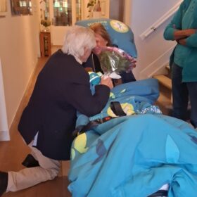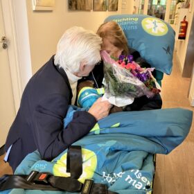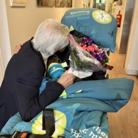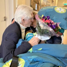 Heel verdrietig omdat ik beloofd had, dat ik hem tot het einde toe thuis zou verzorgen. Wij waren heel verdrietig, omdat we daardoor van elkaar werden gescheiden. Mijn kinderen hebben enorme inspanning geleverd om de zorg voor mij en mijn echtgenoot op zich te nemen. Ik in het ziekenhuis en mijn echtgenoot in het Hospice. Het ziekenhuis heeft voor ons de ambulance van Ambulancewens geregeld en op onze trouwdag werd ik door twee hele lieve vrijwilligers van de Ambulancewens vanuit het ziekenhuis naar het Hospice gebracht. Daar stond mijn echtgenoot- gewassen en aangekleed – op me te wachten. Ging op zijn knieën; vertelde me dat hij gelukkig was en vroeg me weer ten huwelijk. Hij zei erbij, dat niemand had verwacht dat we deze mijlpaal zouden halen. Het moet een enorme inspanning voor hem zijn geweest. De twee vrijwilligers van de Ambulancewens hebben ons in staat gesteld even bij elkaar te zijn samen met onze kinderen. Enorme dank naar de Stichting Wensambulance en de vrijwilligers, die het voor ons heeft mogelijk gemaakt. Zeven dagen later overleed mijn echtgenoot.