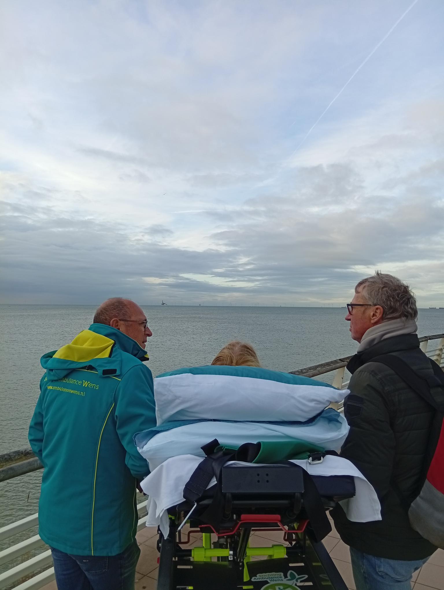 Nog één keer de zee zien, nog één keer met haar voeten in zee. Samen met haar het aanvraag formulier van de wens ambulance ingevuld. Binnen een uur werden we gebeld en een afspraak werd gemaakt! 4 dec om 09:00 stond de wens ambulance (vanuit Rotterdam) in Coevorden voor de deur! Wat een geweldige dag, Fred (chauffeur) en Monika (Zorg) waren zo ongelooflijk lief en behulpzaam voor Lucy, voor ons, we hebben genoten! Met de strandrolstoel in Scheveningen het strand op, langs de branding rijden. Lekker wat eten en drinken in één van de restaurantjes aan de boulevard. Een geweldige dag waar Lucy ontzettend van genoten heeft! 5 dagen later gaf Lucy aan dat ze alles gedaan had wat ze graag wilde en is vredig ingeslapen. Heel veel dank aan deze geweldige organisatie, aan deze mensen die dit nog mogelijk hebben gemaakt! Groet: Rob Crena de Iongh