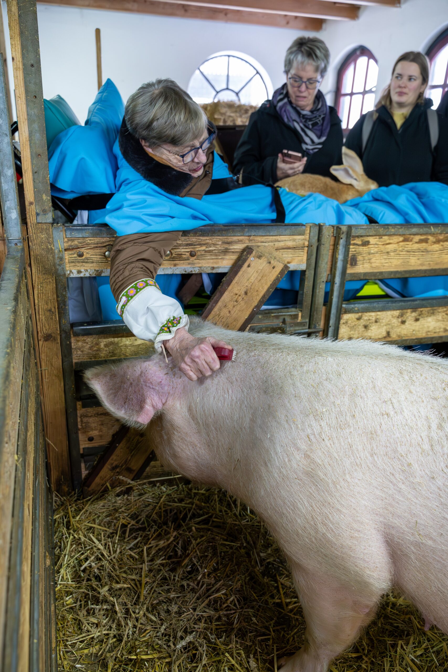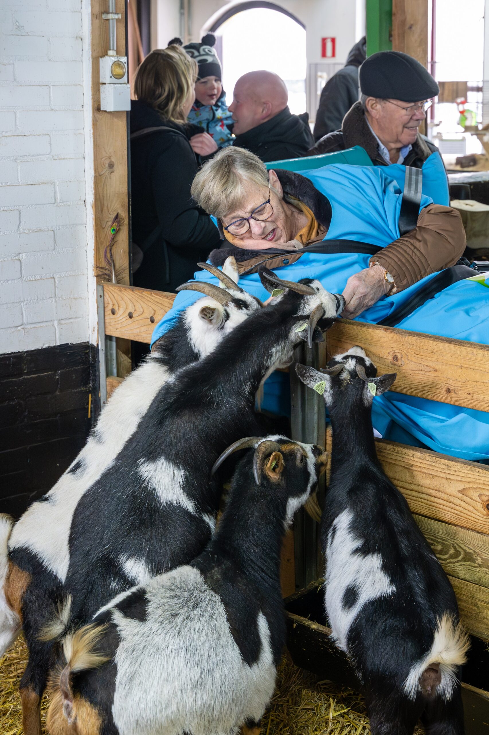 Daar werden we onthaald door aardige medewerkers, een vriendelijke fotograaf die via Ambulance Wens was geregeld, en onze familie. Met vereende krachten werd de brancard door de sneeuw naar de stal gereden, waar diverse dieren op mij wachtten. Ik heb daar heerlijk kunnen kroelen en kriebelen. Zo borstelde ik de snoet van een groot varken, terwijl ik een grote Vlaamse reus op schoot had. Daarna knuffelde ik met een cavia en legde een pony zijn hoofd zachtjes op mijn benen om geaaid te worden.