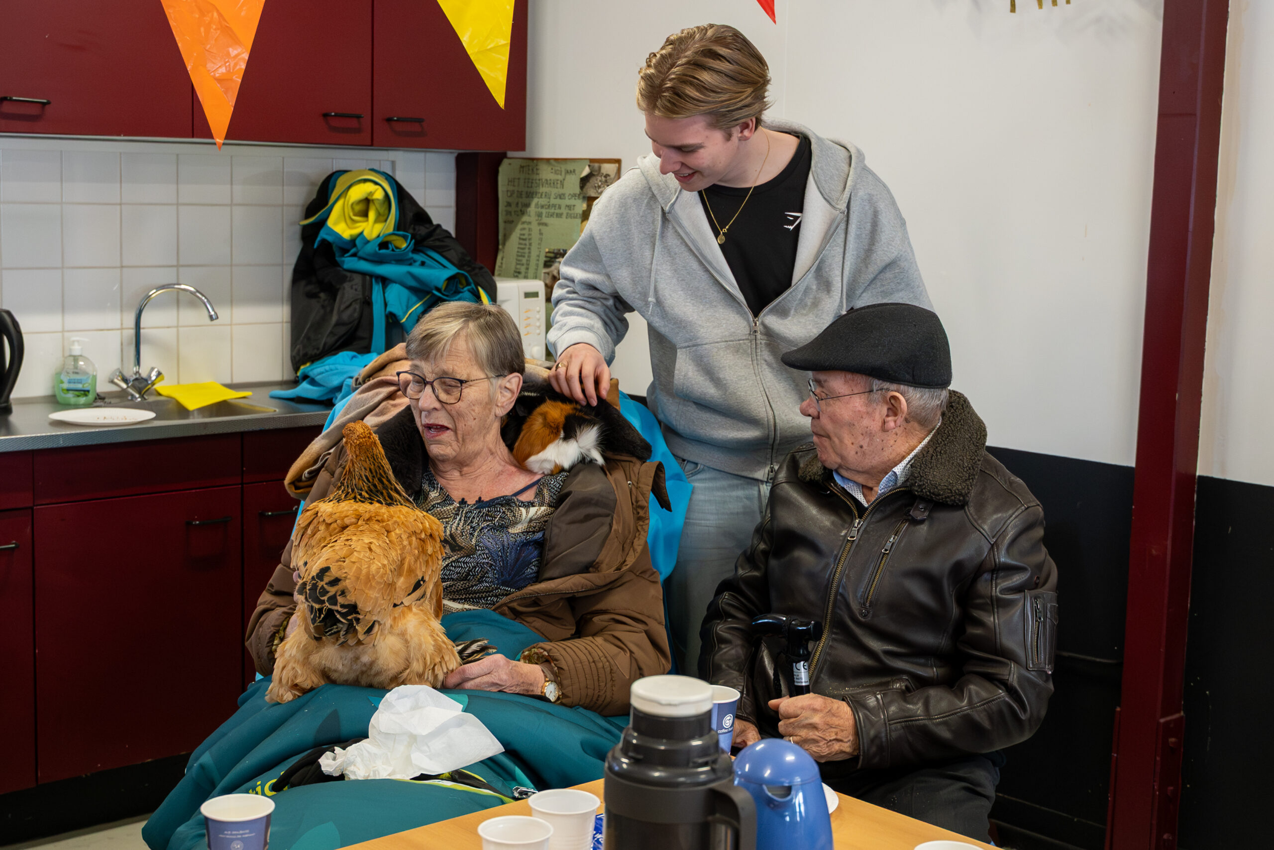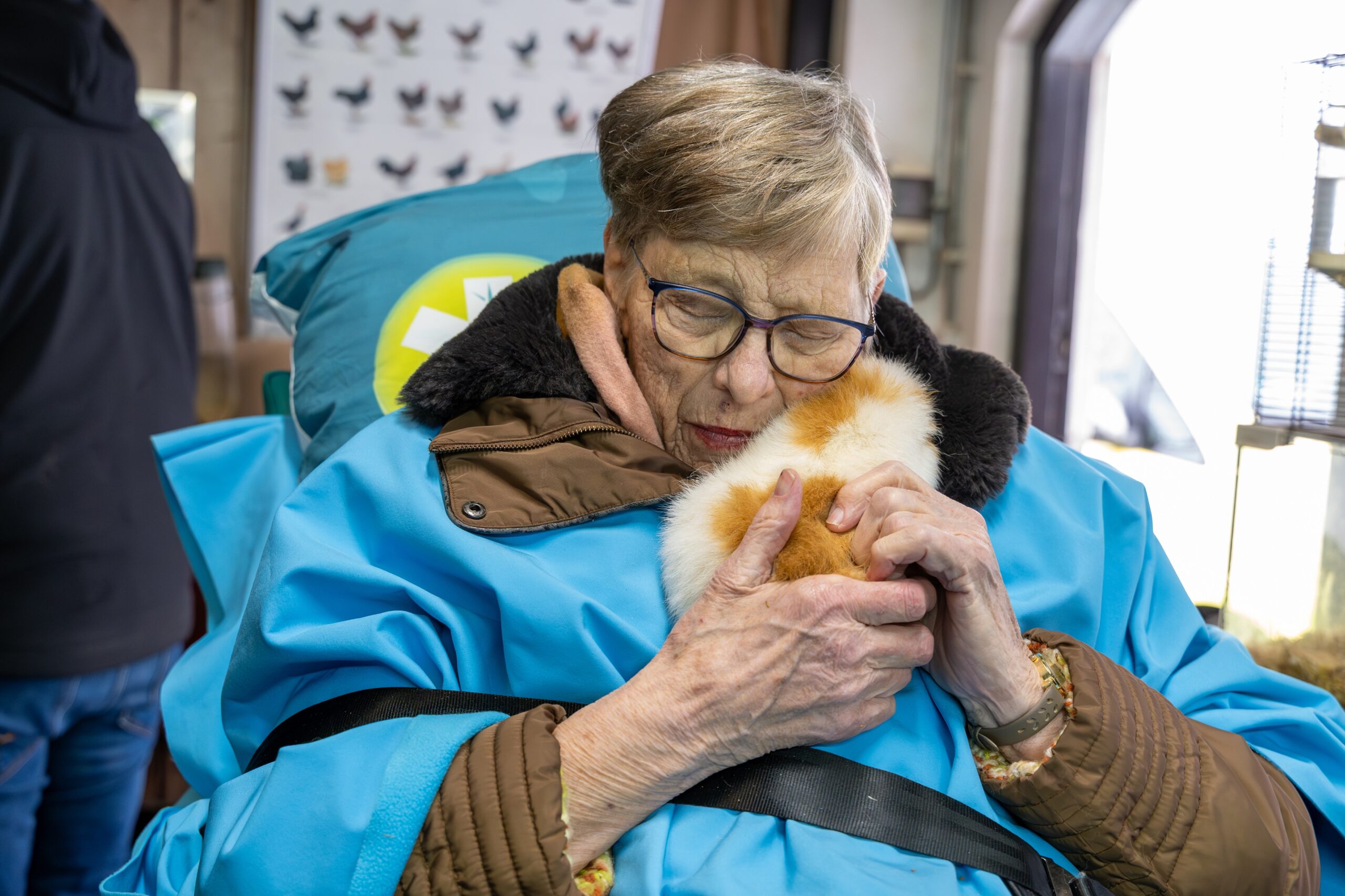 De vrijwilligers van de ambulance waren ontzettend betrokken en zorgden met hun warme inzet voor een fijne en gezellige sfeer. Vervolgens werden mijn familie en ik goed verzorgd met diverse drankjes en heerlijke broodjes, eveneens geregeld door Ambulance Wens. Tijdens dit eet- en drinkmoment werd ik verrast met een grote kip op schoot, samen met een cavia in mijn nek om mee te kroelen.