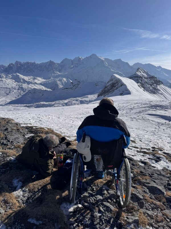 Er lag een enorme laag sneeuw en de zon scheen volop. Urenlang heeft hij daar gezeten, met uitzicht op het Mont Blanc-massief. We hebben allemaal afwisselend geruime tijd bij hem gezeten, mooie gesprekken gevoerd, maar vooral ook genoten van de stilte en de overweldigende schoonheid van de bergen.