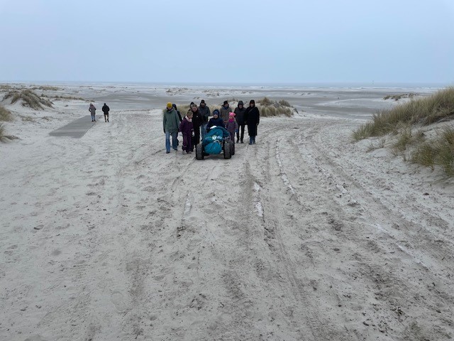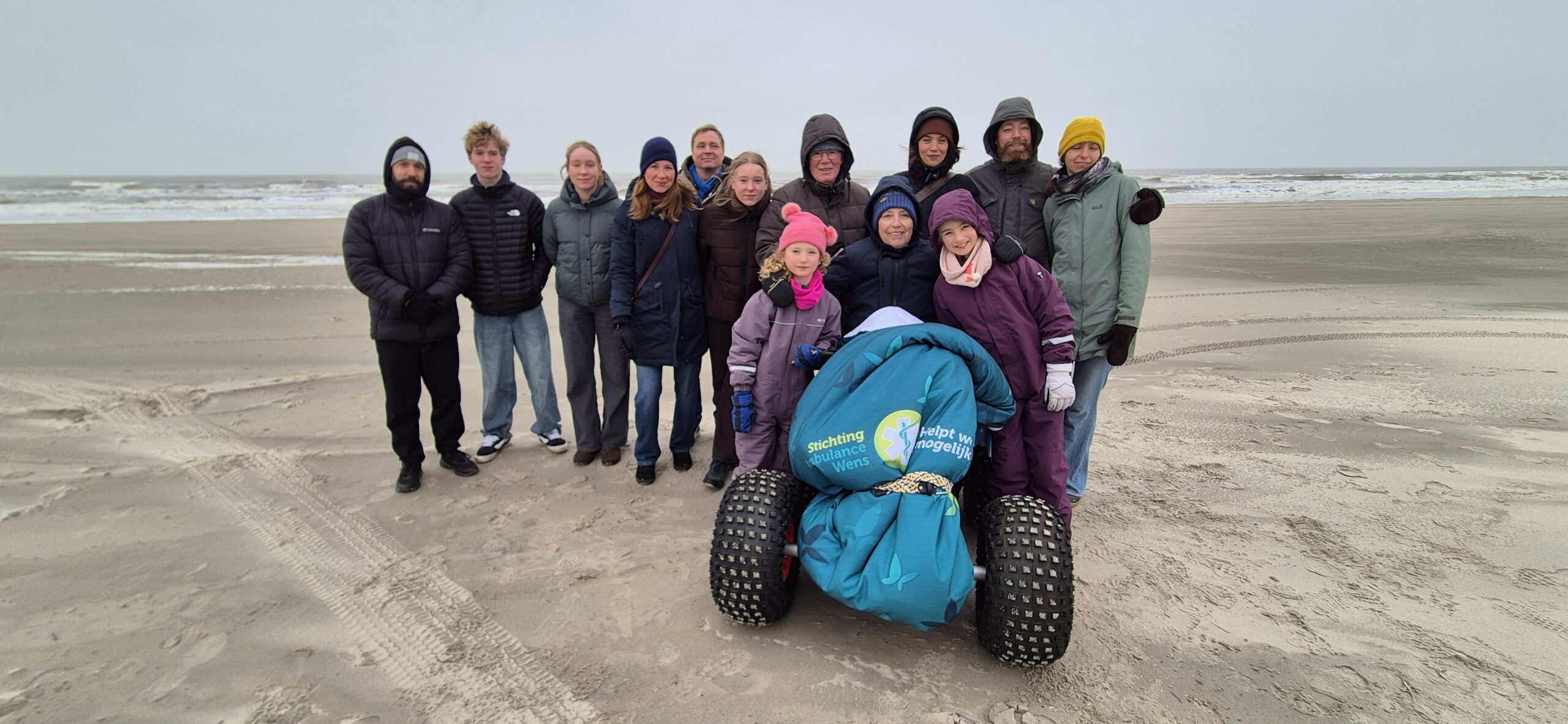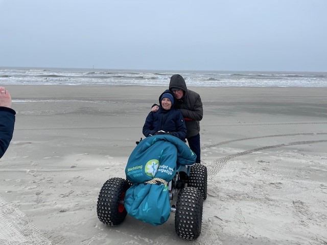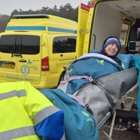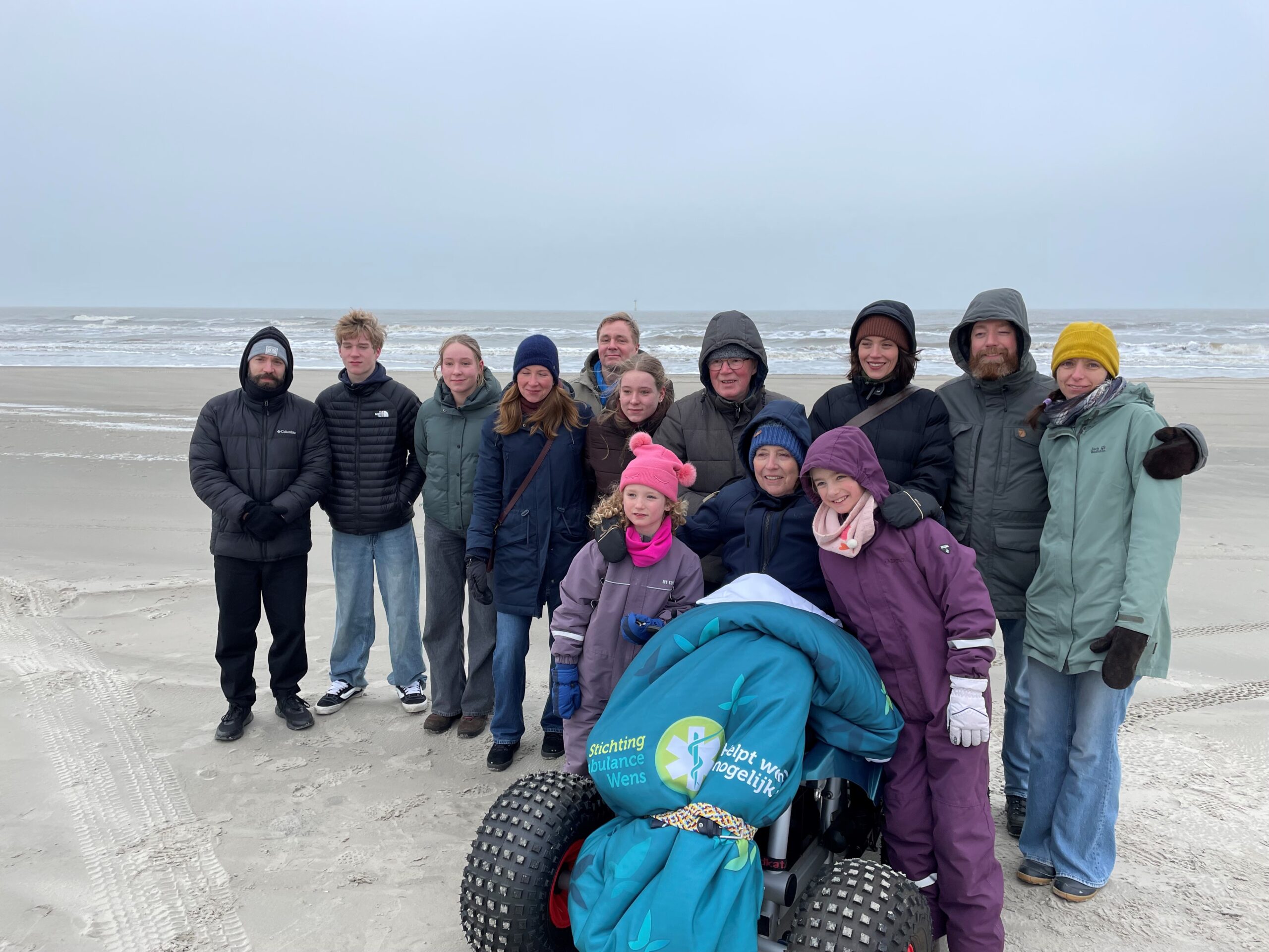 Onze jongste dochter vertelde ons over de Stichting Ambulance Wens en vroeg hoe we het zouden vinden als we onze hartenwens “nog één keer naar Terschelling” aan hen zouden voorleggen. Het leek ons een fantastisch idee. Jelma nam contact op en het balletje ging rollen. Er kwam meer informatie, we werden steeds enthousiaster. De datum werd wat naar voren gehaald zodat ik er ook echt van zou kunnen genieten. En afgelopen weekend was het zover. Alle kinderen, schoon- en kleinkinderen zouden gelijktijdig in hetzelfde hotel aanwezig zijn. Zo fantastisch om dit met het hele gezin te gaan ervaren. Zaterdag om 11.30 uur arriveerden onze geweldige vrijwilligers, Erik en Jan, wat een lieverds, warm, zorgzaam, invoelend en duidelijk. Eerst even kennismaken, koffiedrinken. De schattige mascotte van de Stichting werd door de mannen overhandigd. Toen was het tijd om richting Harlingen te vertrekken. Een mooie rit die vlot verliep, luxe en comfortabel om zo liggend vervoerd te worden. Op de boot troffen we twee van de drie gezinnen. Het gezin uit Denemarken van onze zoon en schoondochter was een dag eerder op het eiland aangekomen. We zaten gezellig met z’n allen in de salon wat te drinken en bij te praten. Nog even rusten in een andere ruimte en toen kwamen we op Terschelling aan, onze droomplek, “the place to be”. We reden van de boot af en direct kwam de Brandaris in zicht, ik schoot in de emotie, tranen met tuiten nu we echt hier waren. Het hotel lag aan één van de mooiste baaien van het eiland. Achter onze ambu stopte een meneer die even met de vrijwilligers en Klaas wilde praten. Het bleek een Terschellinger EHBO’er te zijn die over een ambulance beschikte die over het strand mocht en kon rijden. Hij bood aan morgen een strandrit met ons te maken. Wat een geweldig aanbod, hetgeen graag werd geaccepteerd. De hotelkamer had zeezicht, geweldig. Een vriendin had gezorgd voor flessenpost op de slaapkamer, ook dit was weer zo’n ontroerend moment. Lekker uitgerust tot we gingen eten met elkaar. Het eten was prima. Daarna weer even rusten en toen gingen we bowlen onder in het hotel. Ik heb twee pogingen gedaan, toen was de koek op. Het was genieten om te zien dat iedereen het naar de zin had. Wat een feest zeg! Na een uurtje nam ik afscheid en gingen de anderen nog even door. De volgende ochtend was iedereen tot mijn grote verbazing op tijd beneden bij het ontbijtbuffet. Ongelooflijk zoals de kleinkinderen genoten en aten van alles wat er was, er was geen nee te koop. Dat ze niet misselijk werden mag een wonder heten:}. Na even gerust te hebben gingen we naar Camping Nieuwe Formerum, waar we sinds jaar en dag staan, de laatste jaren in voor- en na seizoen en met de kinderen altijd in de zomervakantie. Jannet en Bastiaan de campingbeheerders kwamen naar buiten en het was een ontroerend weerzien met hen. Zij hadden de Terschellinger pondkoek en koffie en thee voor de ons meegebracht. We gingen daarna met elkaar over de camping en ieder deelde wat herinneringen en allemaal vonden ze de camping zoveel kleiner lijken dan in hun jeugd. Daarna arriveerde de EHBO ambulance en gingen we bij Formerum het strand op, wat een belevenis. Bij de zee aangekomen werden de achterdeuren opengedaan, zodat we ook direct naar buiten konden kijken, we roken en hoorden de zee, alle zintuigen stonden open, zo’n intense, tranentrekkende ervaring, zo mooi en kostbaar. We gingen tot heartbreakhotel, stonden even stil om er nog een goeie laatste blik op te werpen en toen weer terug naar Kaap Hoorn. Onderweg zagen we nog een huiler, we hoopten dat hij lag te rusten en niet verdwaald was. Bij Kaap Hoorn stond een elektrische rolstoel klaar. Wat een feest om daarmee naar de vloedlijn te rijden. In het begin was het behoorlijk wennen, ik schoot alle kanten op behalve de goede, maar op enig moment lukte het toch er wat sturing over te krijgen. Echt lachen om daarmee over het strand te rijden, geweldig, dikke pret! De magen begonnen te rammelen, dus de hoogste tijd om te gaan lunchen, gezellig met z’n allen heerlijk gegeten en wat gedronken, gekletst, quality time. Het was tijd om te rusten voor mij en de kinderen gingen nog gezellig West even in met elkaar. Om half zes voeren we met de boot weer naar Harlingen, aan boord aten we nog wat en toen was het afscheid nemen van elkaar. Met Erik en Jan gingen we door naar Heerde waar ze bij aankomst nog wat dronken en napraten over een geweldig weekend. Het is nu een dag later en het gevoel van euforie blijft, wat een groot cadeau is dit, een droomwens is vervuld, hoe kostbaar en onbetaalbaar.