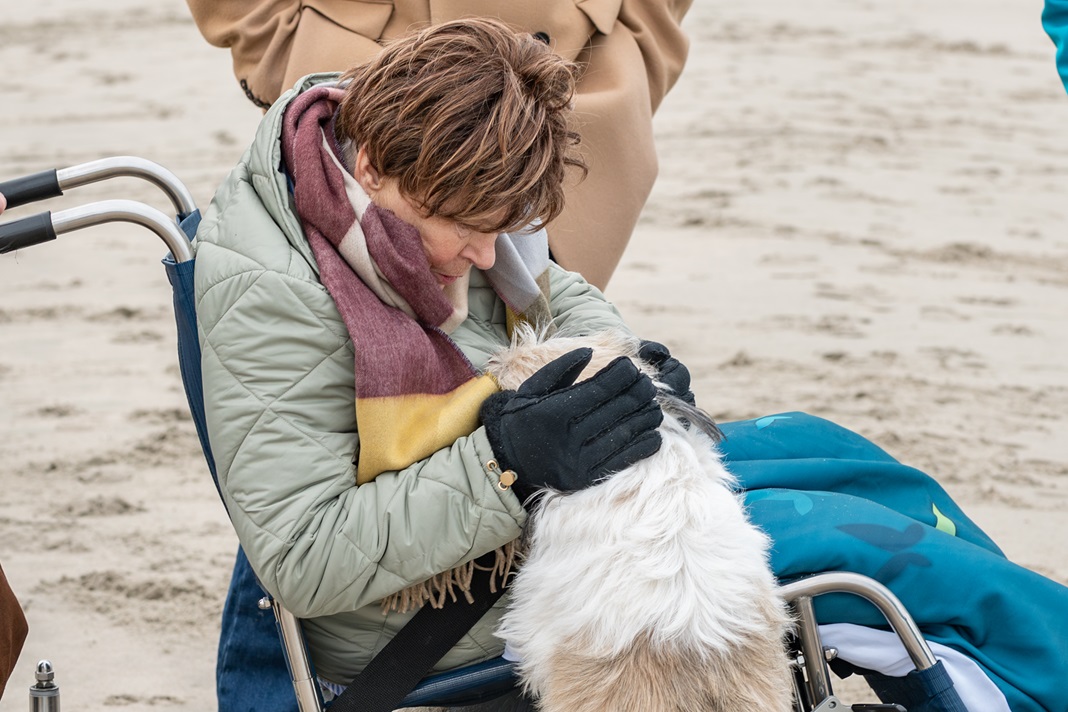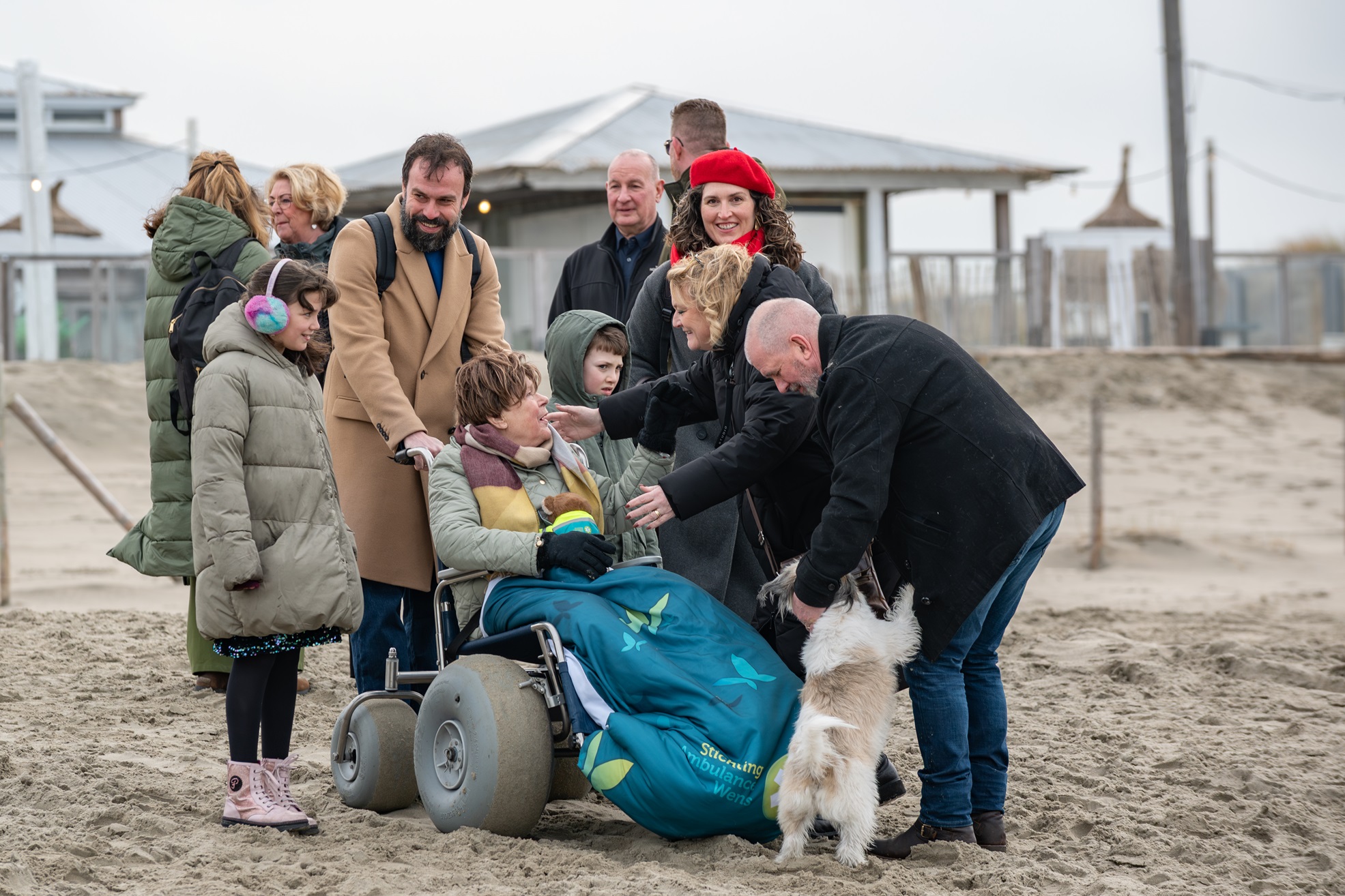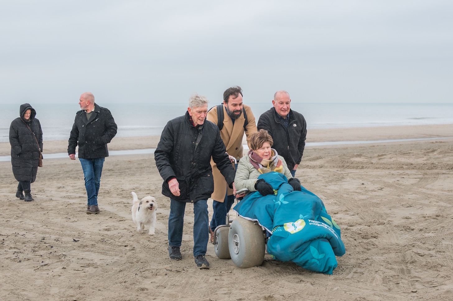 Mijn moeder wordt vanuit de brancard in de strandrolstoel geholpen. Zo gaan we met z’n allen het strand op. Mijn broertje (ondertussen al iets groter dan ik) duwt mijn moeder in de rolstoel en samen lopen we gezellig over het strand. Zo bijzonder dat dit kan. Het is best koud, dus na ongeveer een half uurtje keren we weer om. Het omhooggaan met de rolstoel is wat lastiger, maar met een hoop gelach en meerdere helpers komt het helemaal goed.