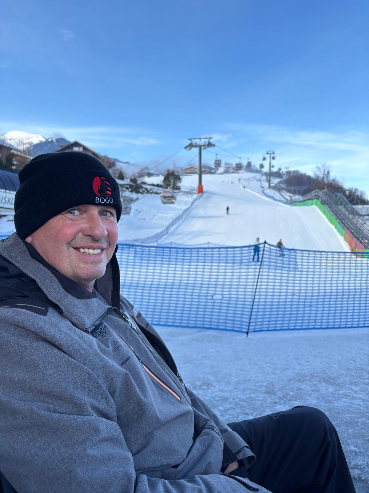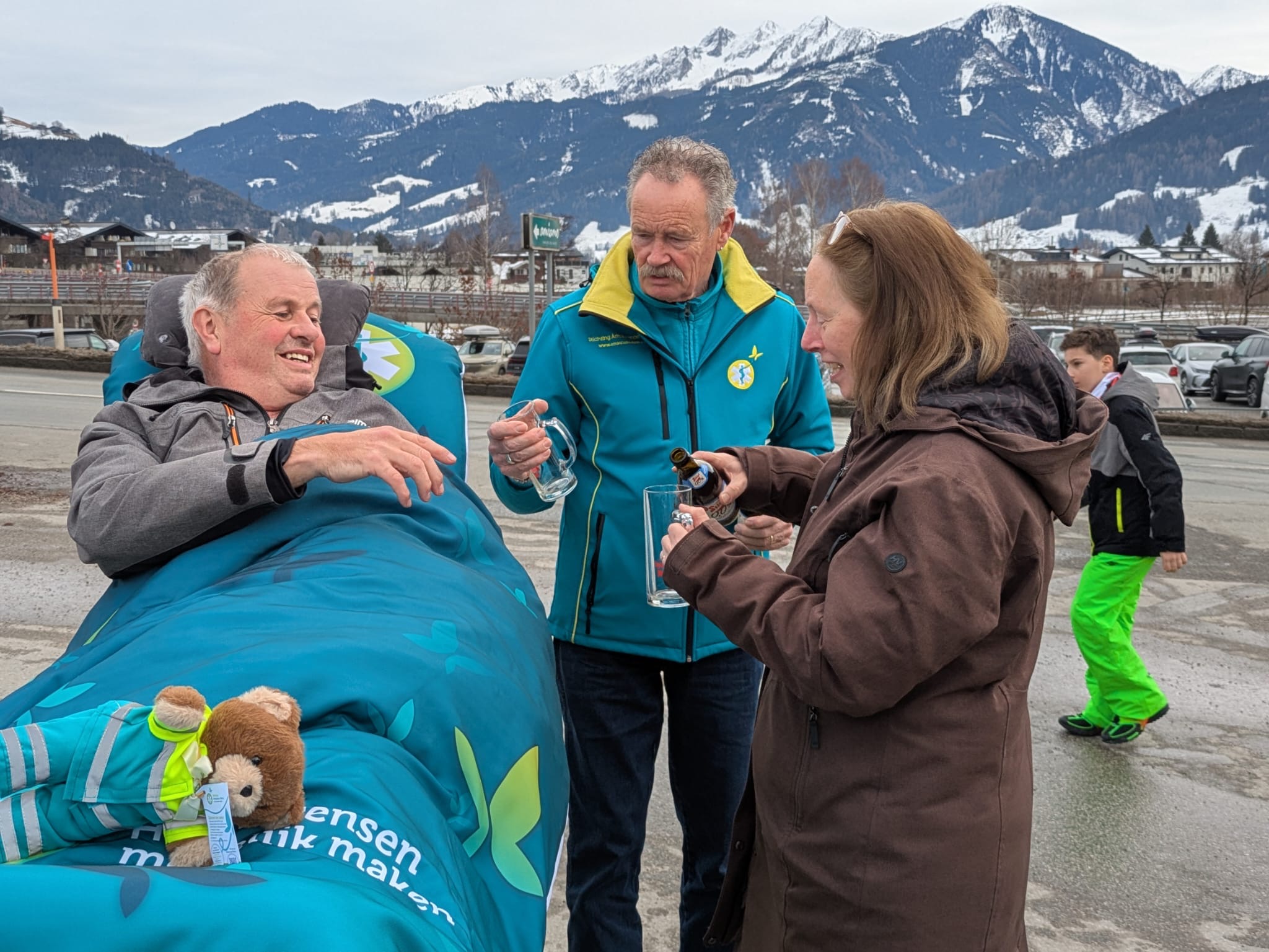 Met de rolstoel liepen we naar de skipiste en hebben we daar heerlijk in de zon toegekeken naar de skiërs en snowboarders. Vervolgens zijn we door het dorpje gelopen en hebben we met de vrienden geluncht. In de middag zijn we met de ambulance rondgereden langs andere pistes in de buurt. We hebben herinneringen opgehaald en samen een drankje gedaan.