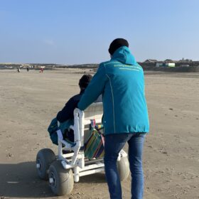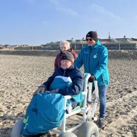 In Noordwijk aangekomen gingen we naar strandrestaurant De Zeemeeuw, waar hij met brancard en al naar binnen werd gereden, geen probleem. Een lekker bakje koffie met appeltaart en slagroom ging er wel in. Het restaurant had een strandrolstoel met dikke banden en we gingen lekker uitwaaien op het strand. Wat was het heerlijk! Het zonnetje scheen, de zee was prachtig en de kou viel ook heel erg mee. Het was echt even genieten. Ook zagen we ineens in de verte zeehondjes… Dat bleken later aalscholvers te zijn!